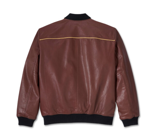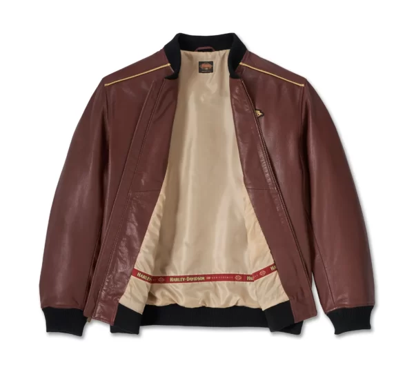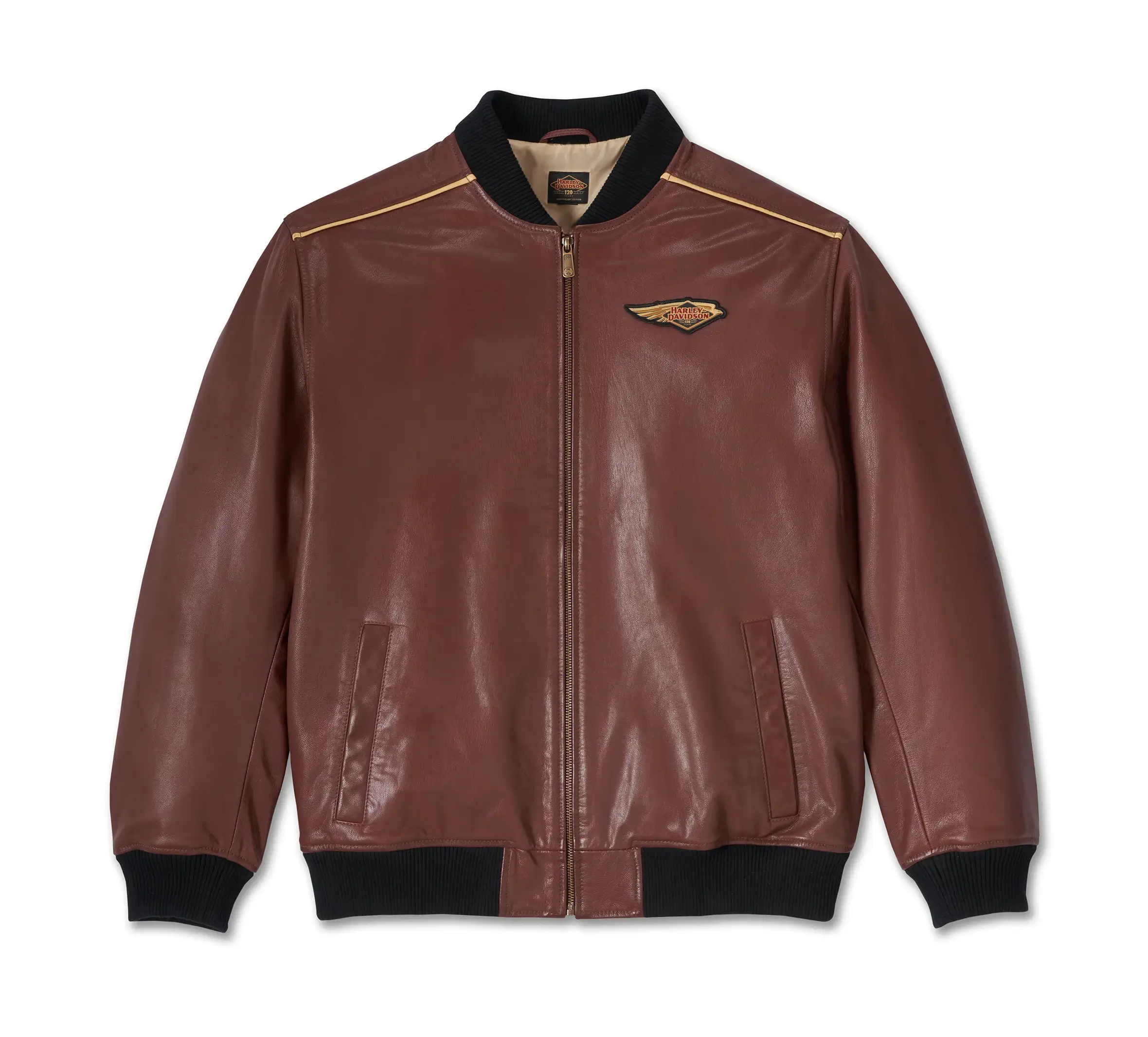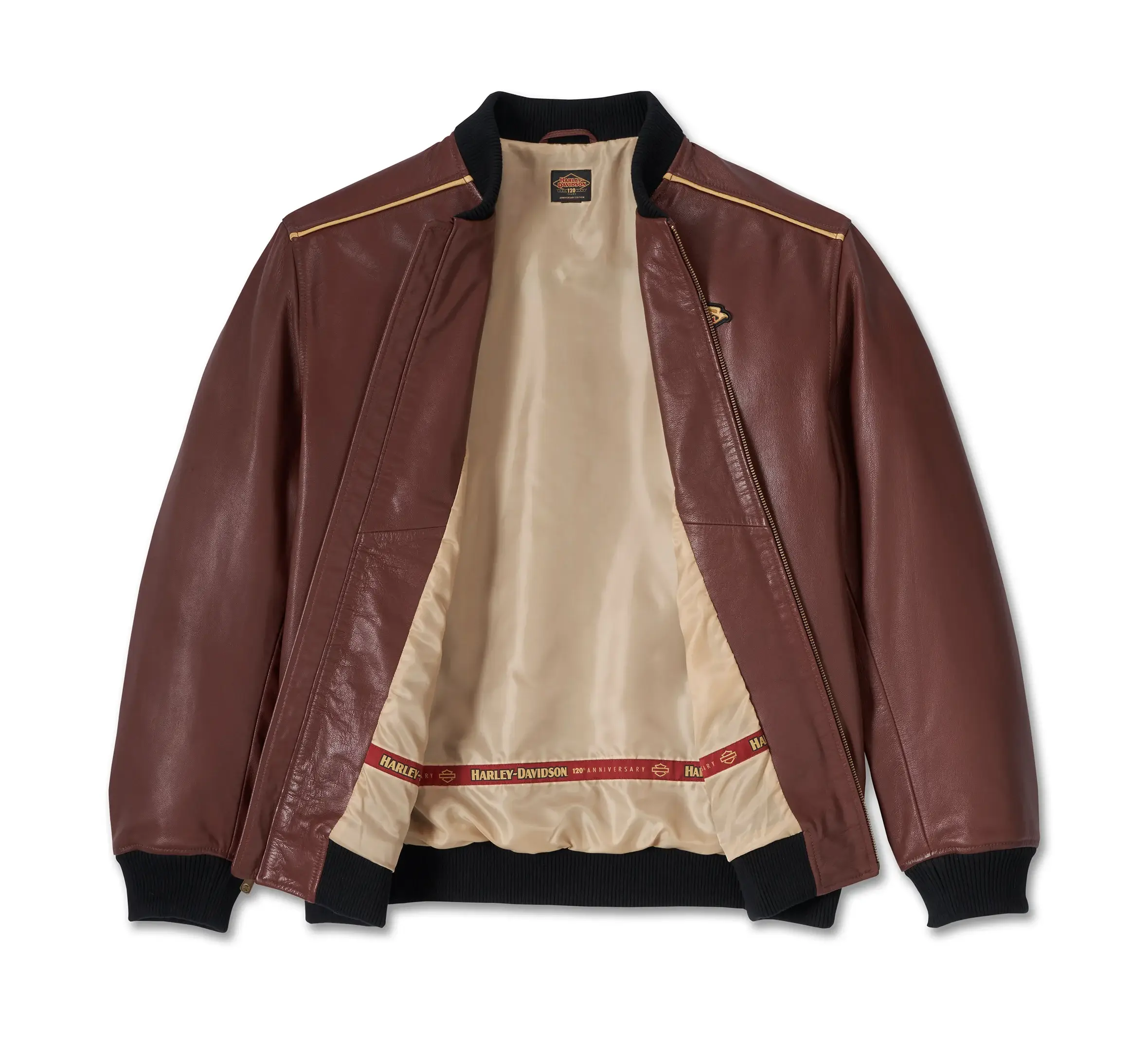 Harley-Davidson 120th Anniversary Férfi bőrdzseki – Rum Raisin Középsúlyú kecskebőr, 100% poliészter bélés Elől cipzáros Szövött 120. évfordulós Speed Bird címke