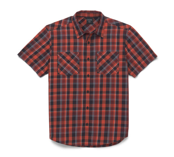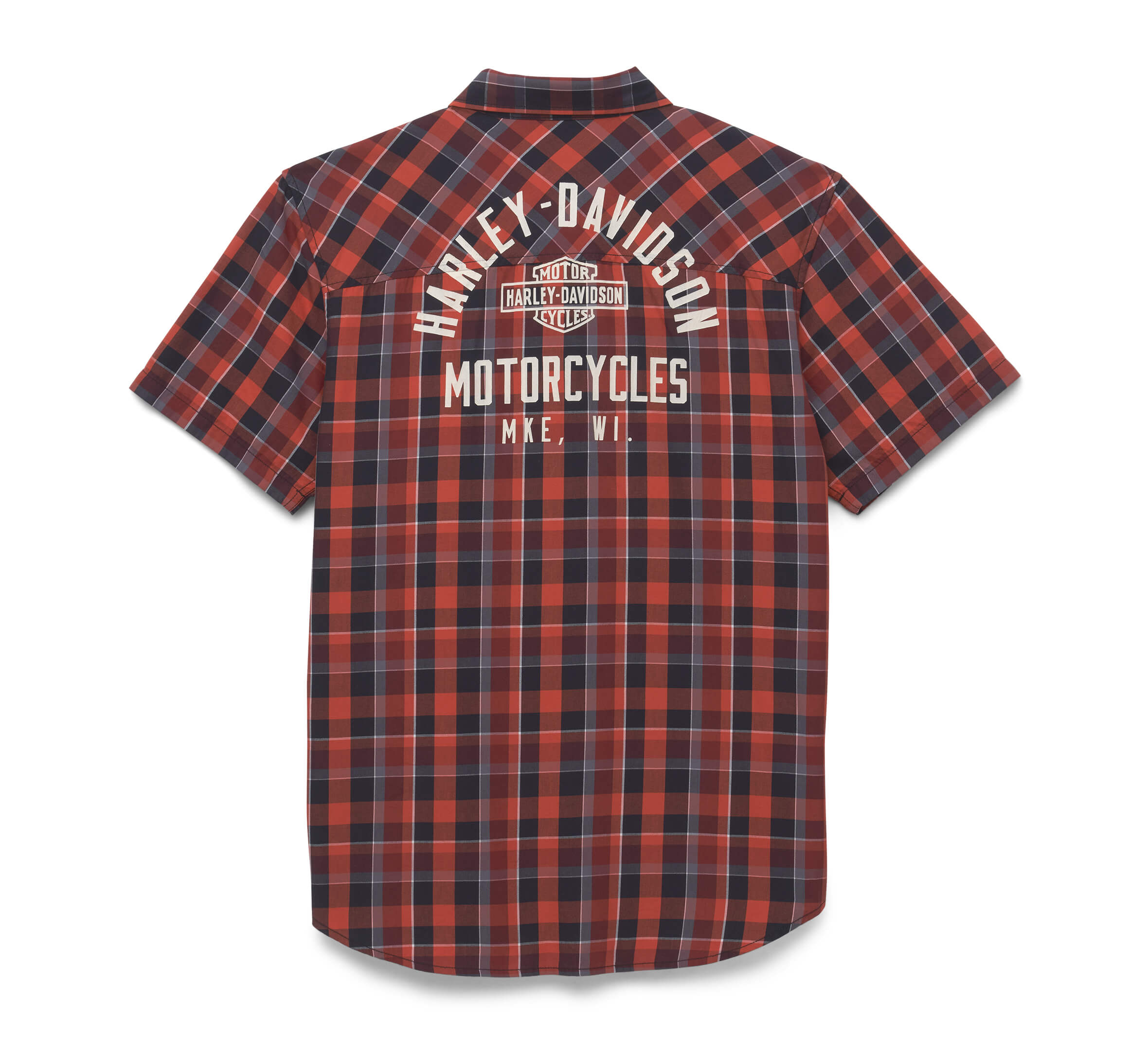 Harley Davidson Férfi MKE rövid ujjú ing – Orange Plaid 100% Pamut twill, Nyomtatott grafika