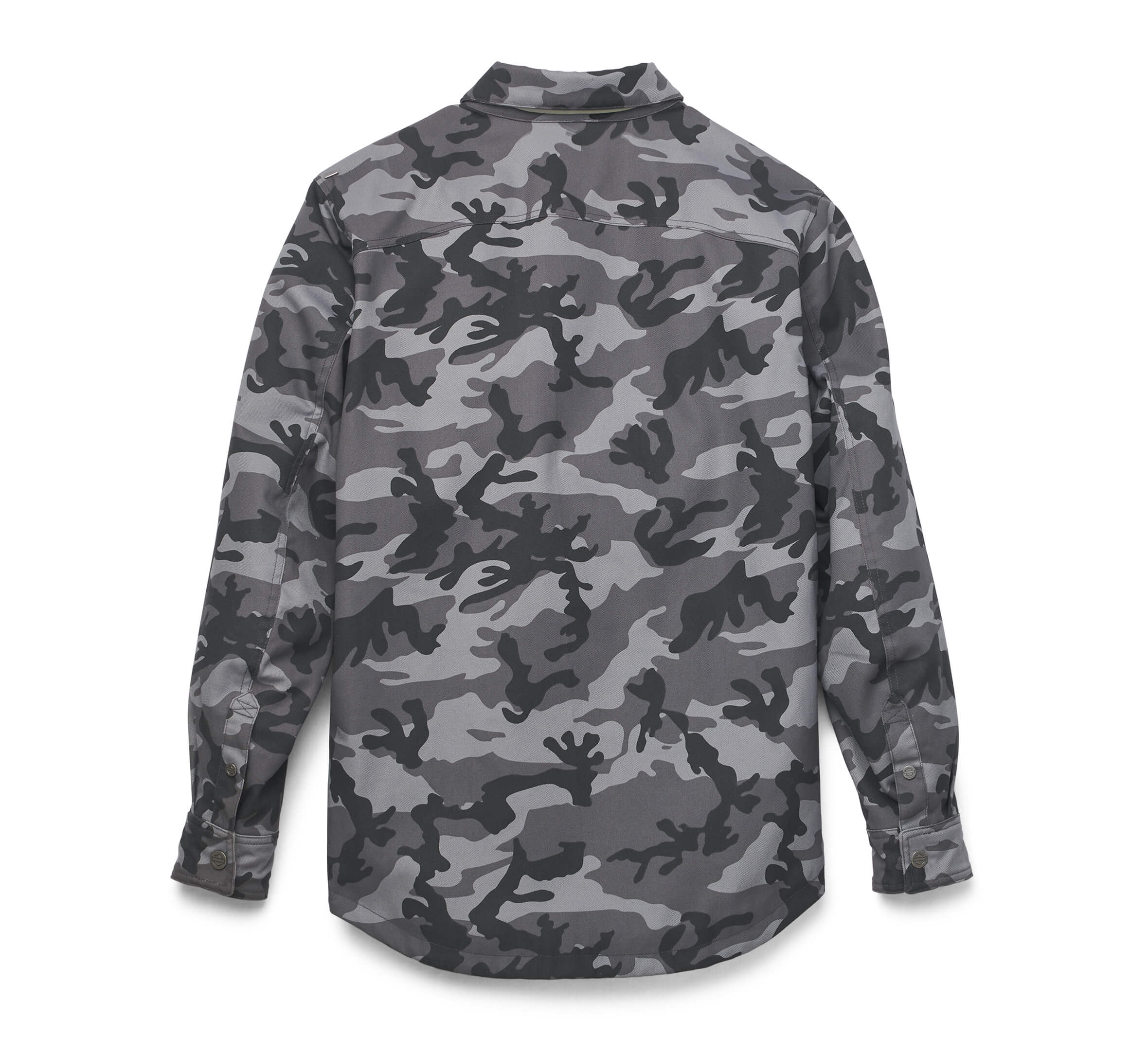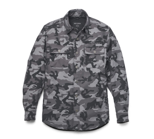 Harley-Davidson Férfi Operative Riding Dzseki – Grey Camo 60% Pamut 40% Poliészter twill. 100% poliészter hálós bélés. EN 1621-1 CE-jóváhagyással rendelkező, levehető páncél a könyöknél és a vállaknál.