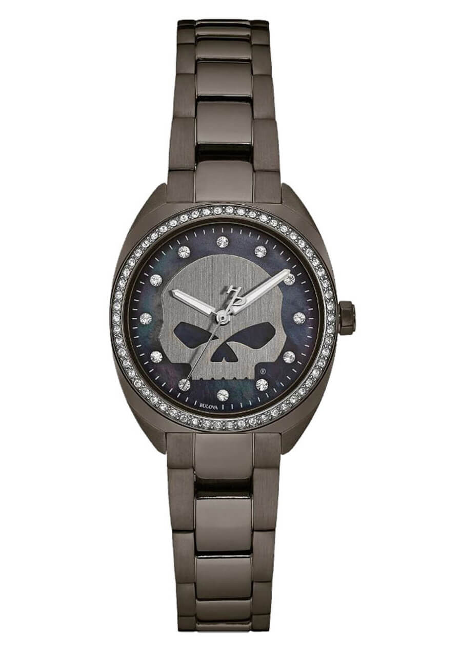 Harley-Davidson Női Crystal Willie G Skull Watch, Gunmetal kivitelben 70 kristályt tartalmaz az előlapon és az órajelzőn, Masszív rozsdamentes acél tok és karkötő gunmetal ion bevonatú