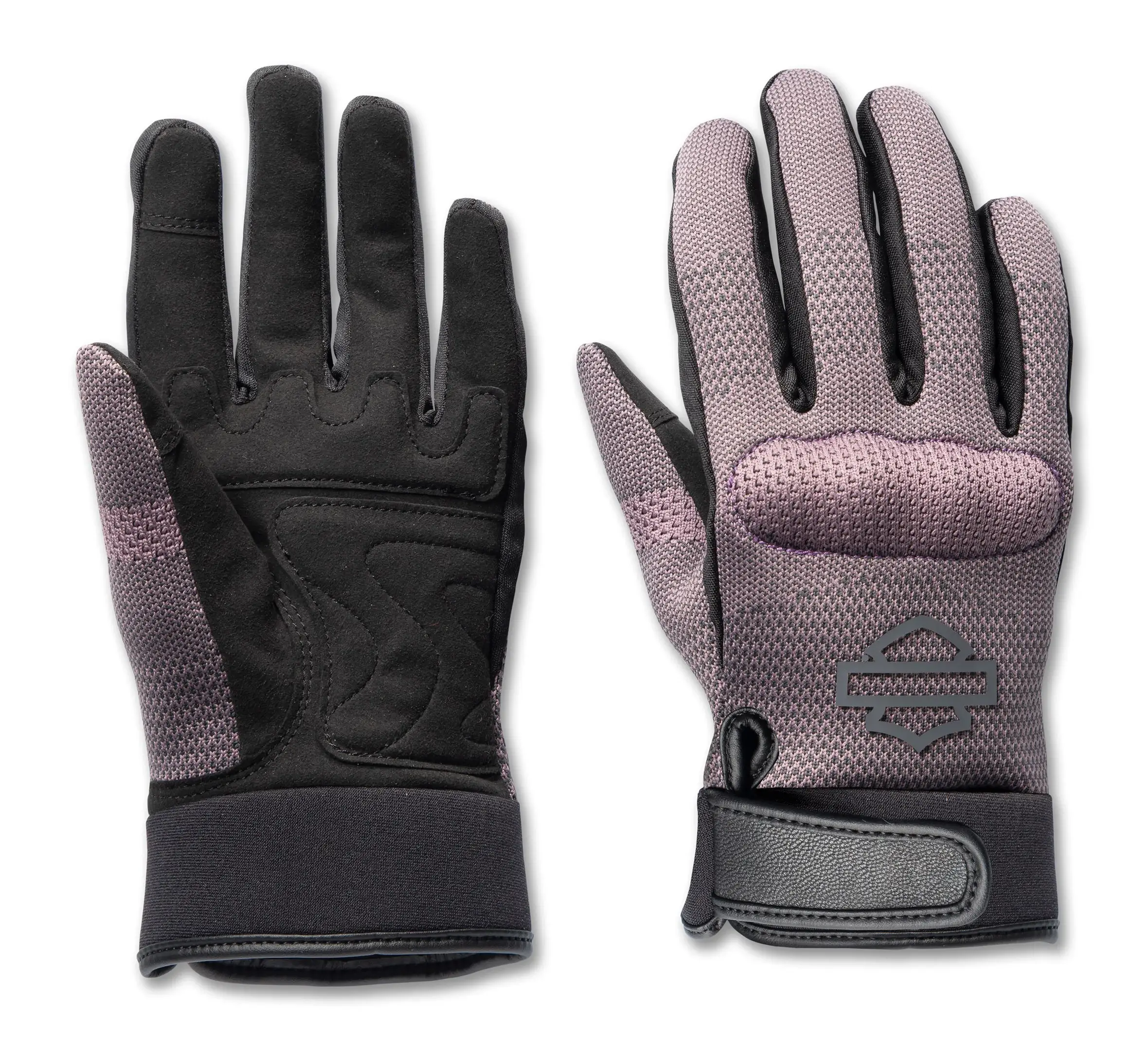Harley-Davidson Női Dyna Knit Mesh kesztyű Stay Cool: Hálós részek a légáramlás elősegítésére 100% poliészter. Művelúr. Poliészter trikó bélés. Neoprén, tépőzárral a mandzsettán. Párnázott tenyér és ujjak