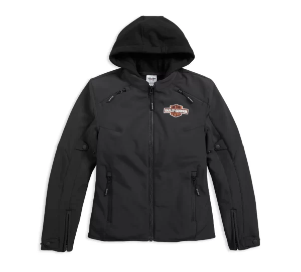 Harley-Davidson Női Legend 3-in-1 Soft Shell Riding dzseki Vízálló és lélegző membrán. A kivehető pamut/poliészter teljes ujjú kapucnis extra meleget biztosít, külön is viselhető. Két váll szellőzőnyílás és egy hátsó vízszintes kilépőnyílás. EN 1621-1 CE-jóváhagyott eltávolítható páncél a könyöknél és a vállaknál. A hátsó testpáncél zseb illeszkedik a CE 1. szintű hátpáncélhoz. Anyagok: Kopásálló háromrétegű softshell 95% poliészter, 5% spandex. Poliészter hálós TPU bélés.