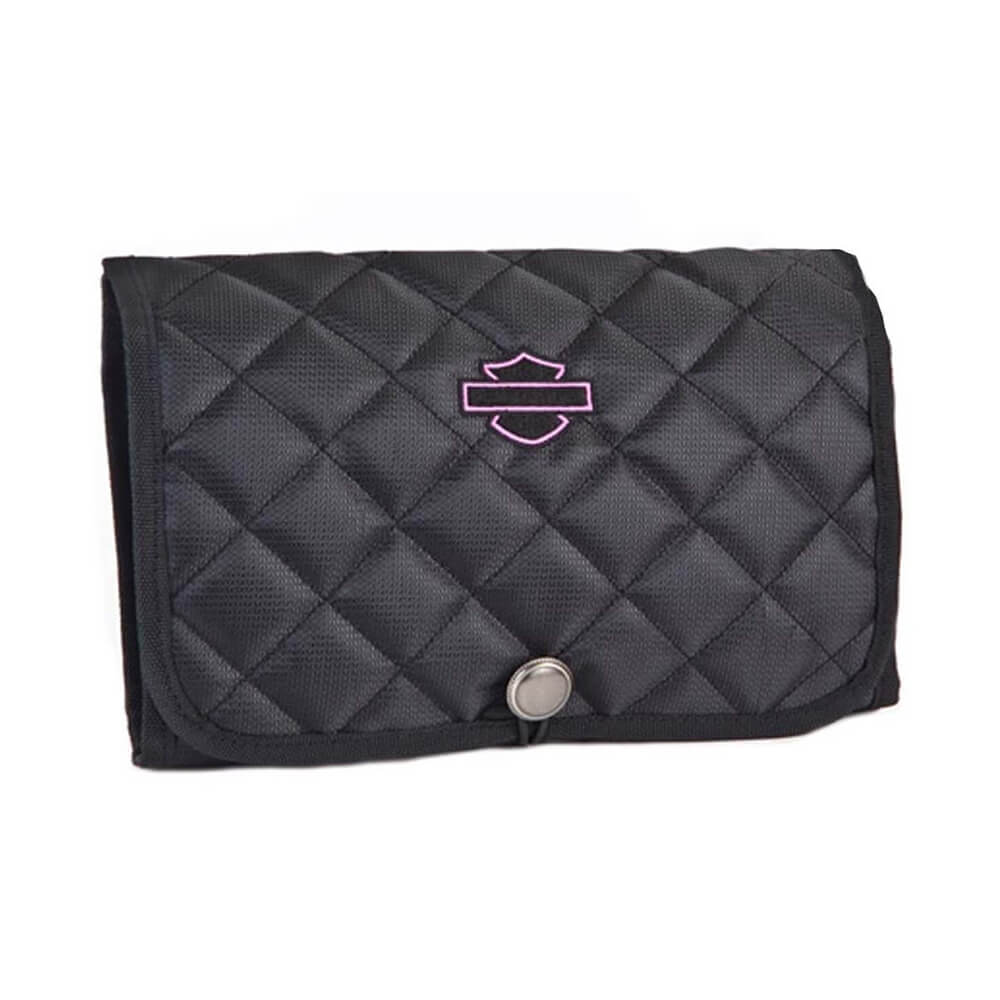 Harley-Davidson Női piperetáska Fém akasztó kampó Két nagy belső cipzáras zseb Belső része rózsaszín/fekete kígyóbőr dizájn bélés. 3 átlátszó vízálló hasított zseb. 20Cm X 29cm X 3,8cm