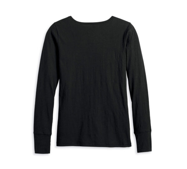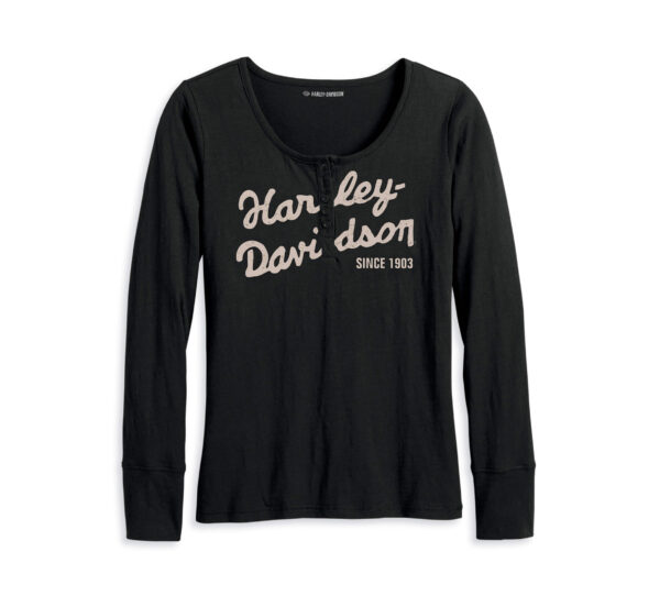 Harley Davidson Női Suspension Scoop Neck Henley hosszú ujjú póló – Black Beauty 100% Pamut Kézi nyomtatás